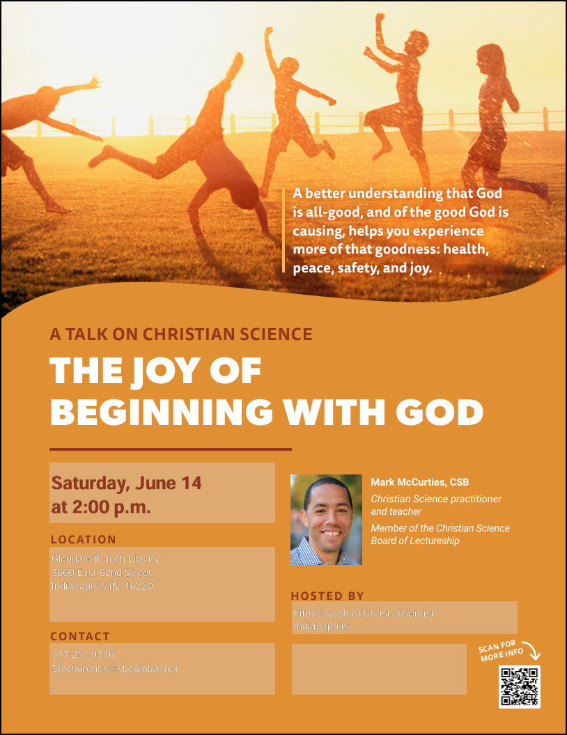 In this lecture, I’m going to take a different approach. I’d like to talk about causation, from a spiritual point of view. In other words, what is God causing? What kind of effects does God’s causative power produce? The Bible promises that God is causing only good. So in this lecture, I will explore how a better understanding of the good that God forever causes, can help us to experience more of that goodness in the form of health, peace, and safety for our world. In the beginning, from the beginning, and without beginning, God is causing good. As loved children of God, we each have a divine right to feel the effect of that divine goodness in our daily lives. I invite you then, to come learn more about the joy of beginning with God!